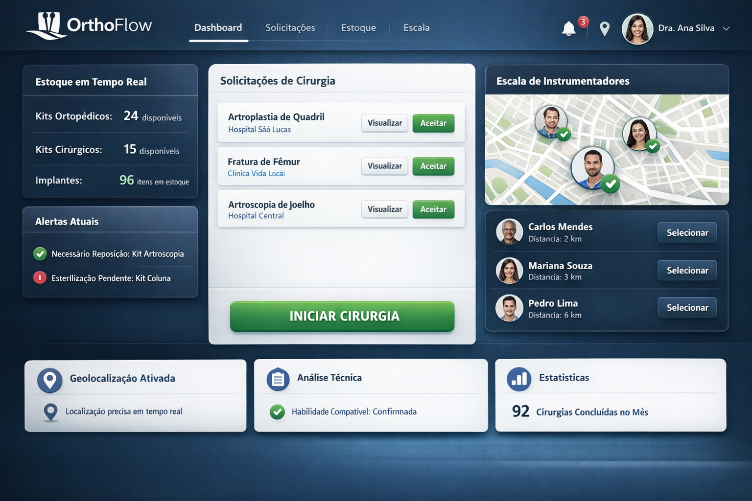 Domínio total em instrumentação cirúrgica. Automação de estoque em tempo real e recebimento inteligente de solicitações. Escala de instrumentadores via geolocalização e habilidade técnica. Disparo de cirurgia a um clique para soberania hospitalar.