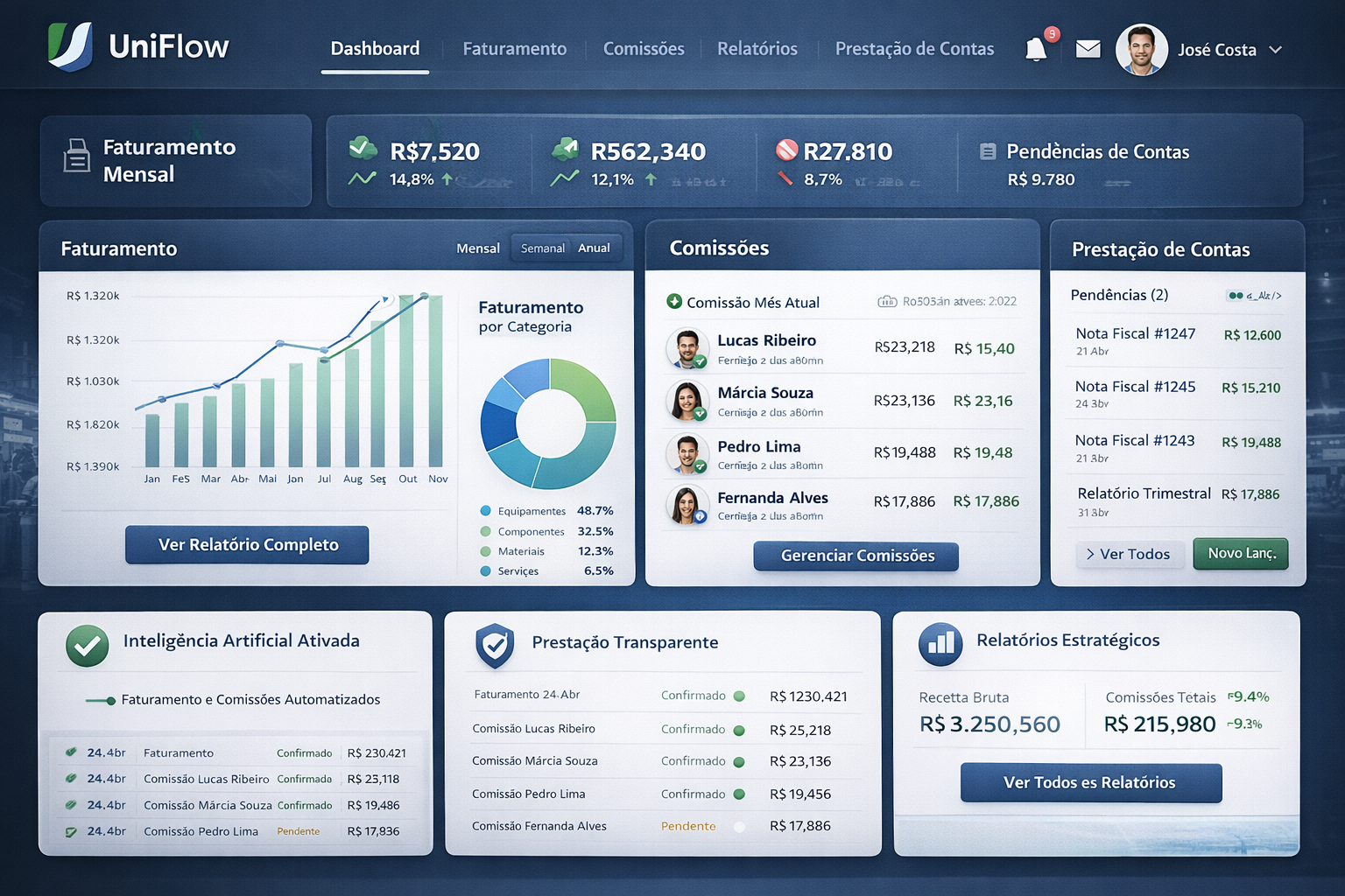 Governança absoluta do chão de fábrica ao dashboard executivo. Faturamento e comissões automatizados por IA, com prestação de contas transparente e relatórios estratégicos que blindam a saúde financeira da sua indústria.